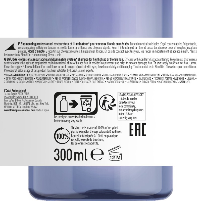 Blondifier Gloss atkuriančios paviršių* ir žvilgesio suteikiančios sistemos šampūnas šviesiems plaukams. Profesionali formulė praturtinta acai uogų ekstraktu, kuriame yra polifenolių. Šampūnas švelniai plauna plaukus ir išryškina daugiamatį šviesių plaukų žvilgesį. Šampūnas su polifenoliais, kurių yra aliejinių kopūstpalmių uogų ekstrakte, maitina ir švelnina pažeistus plaukus.