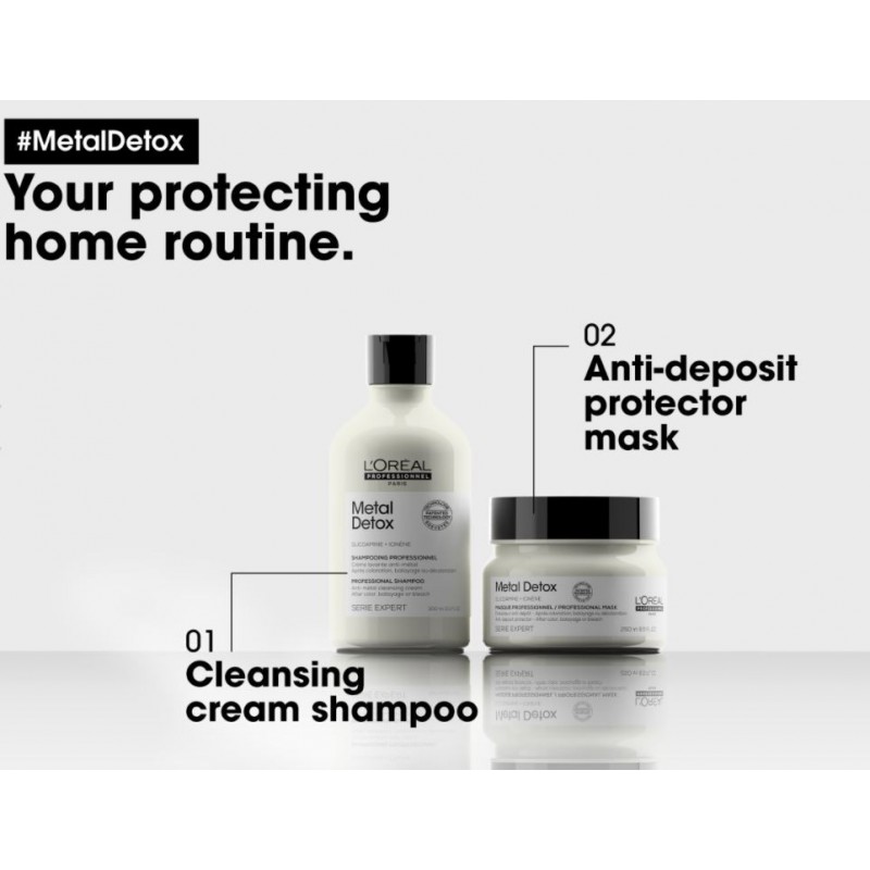 Metal Detox Apsauginė kaukė padeda apsaugoti plaukus nuo vario ir dalelių kaupimosi, pertekliaus atsirandančio iš vandens, kuris gali paveikti Jūsų plauko spalvą. Priemonė padeda išlaikyti plaukų spalvų ryškumą. Glikoaminas neutralizuoja plauko pluošte esančius metalus ir detoksikuoja plaukus.