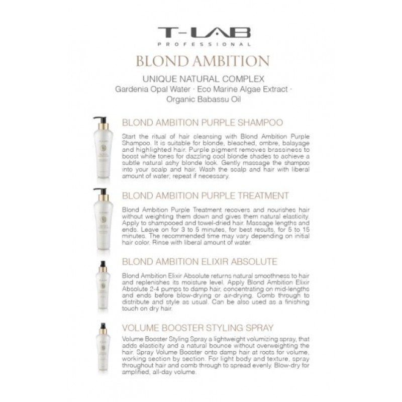 Tinka šviesiems, balintiems, ombre, balayage ir sruogelėmis dažytiems plaukams. Purpurinis pigmentas pašalina žalumą, kad paryškintų šaltus šviesius atspalvius ir būtų pasiekta subtili natūralios peleninės blondinės išvaizda. „Blond Ambition Duo“ šampūnas yra sukurtas su unikaliu natūraliu kompleksu, pagrįstu sertifikuotais ekologiškais ingredientais, turinčiais ultravioletinį pigmentą; sukurtas valyti, neutralizuoti nepageidaujamus geltonus atspalvius šviesiuose, balintuose ar sruogelėmis dažytuose plaukuose, suteikiant šaltą-neutralų rezultatą bei tuo pačiu nuramina jautrią galvos odą. Be žiauraus elgesio ir prieš bandymus su gyvūnais. 95% natūralus produktas. Likę 5% turi užtikrinti aromatą, sensorinį ir formulinį stabilumą. Tinka veganams.